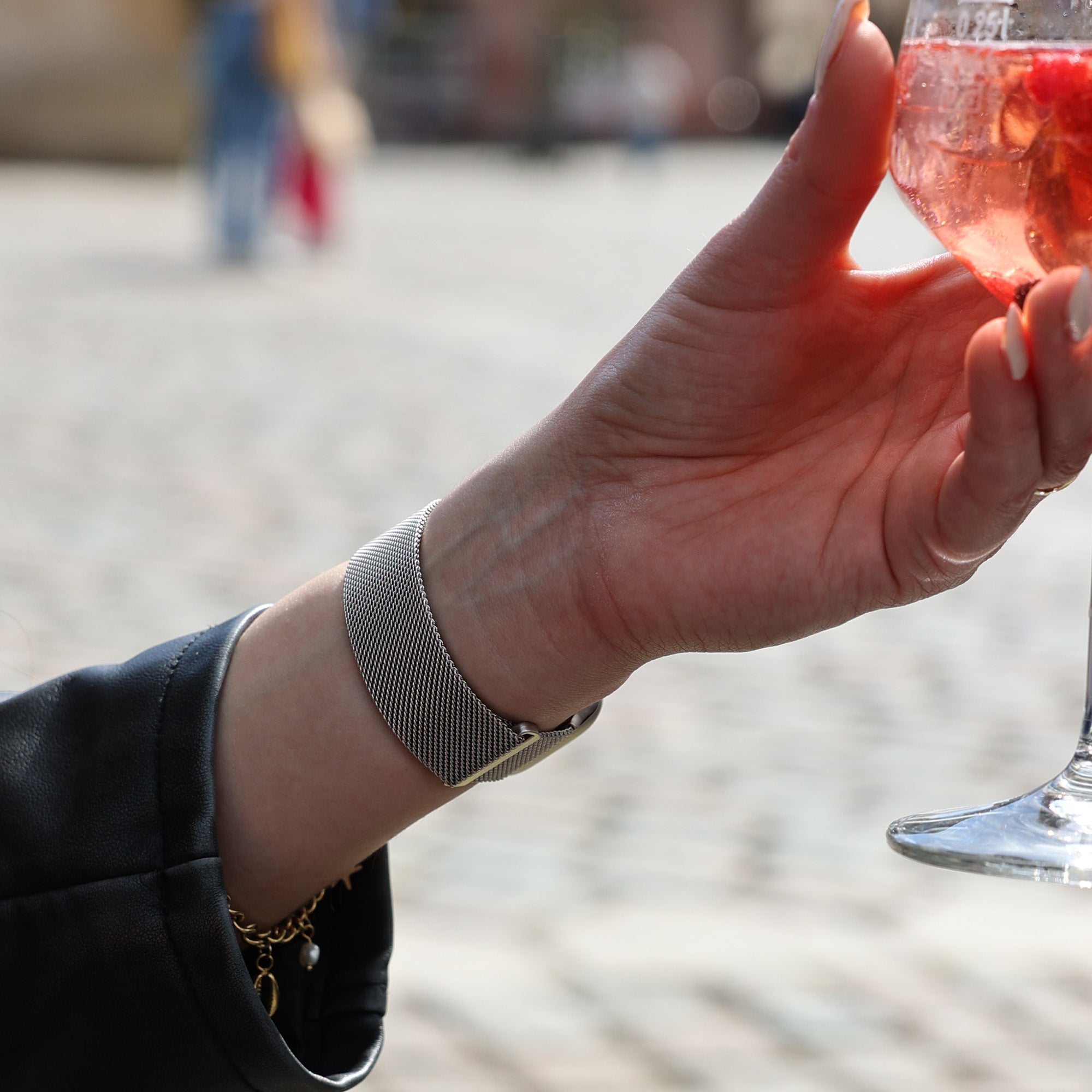 Bitte miss den Umfang deines Handgelenks (nicht die Länge des Armbandes!) mit einem flexiblen Maßband. Alternativ kannst du einen ca. 2,5cm breiten Streifen aus Papier schneiden.